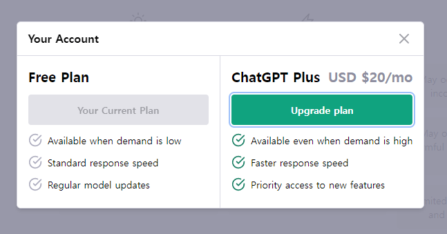 하지만 GPT-4는 현재 무료로 제공하고 있지는 않고 ChatGPT Plus를 구독해야 사용할 수 있습니다. 가격은 1개월에 20달러입니다.